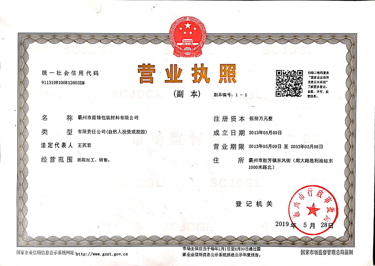 霸州市藍鋒包裝材料有限公司,前身為成立于1988年的勝芳鎮藍劍紙箱廠。